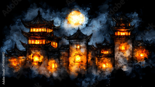 ancient, asian, city landscape, night, illuminated, building, glowing, window, mystical, atmosphere, full moon, history, culture, architecture, traditional, landscape, art, watercolor, fantasy, skyline, dark, vibrant, orange, blue, silhouette, heritage, scenic, peaceful, night sky, artistic, detailed, magical, serene, historical, night time, light, shadow, beauty, warm, cool, enchanting, creative, atmospheric, visual, design, colourful, unique