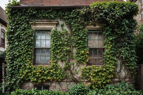 Ancient building front covered in lush ivy