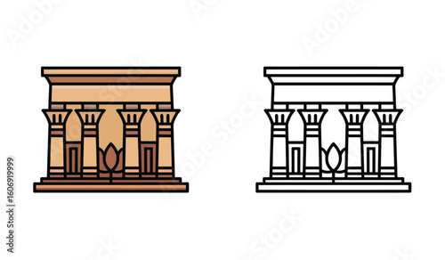 Ancient Egyptian Temple Icon with Lotus Design in Color and Outline Styles