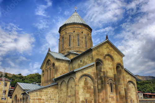 Ancient georgian cathedral on mountains and clouds background at sunny day