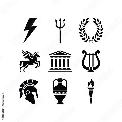 greek, mythology, symbol, icon, ancient, greece, classical, pegasus, lightning, bolt, zeus, trident, poseidon, laurel, chaplet, victory, temple, parthenon, architecture, lira, music, harp, helmet, warrior, spartan, amphora, vase, pottery, torch, flames, fire, culture, history, art