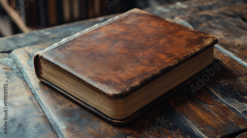 Ancient Leather-Bound Book: A weathered, leather-bound book rests on a rustic wooden table, hinting at untold stories and forgotten wisdom.