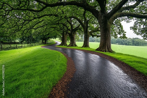 ancient, oak, tree, casting, long, shadow, along, country, walking, path