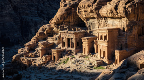 Ancient rock-carved structures of Petra under a bright blue sky, historic archaeological site, desert landscape,