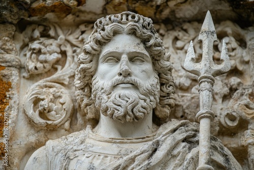 Ancient roman god neptune statue holding trident, decorated with floral motifs