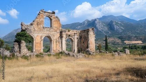 Ancient ruins of a historic landmark surrounded by nature with mountains in the background showcasing weathered architecture and lush scenery