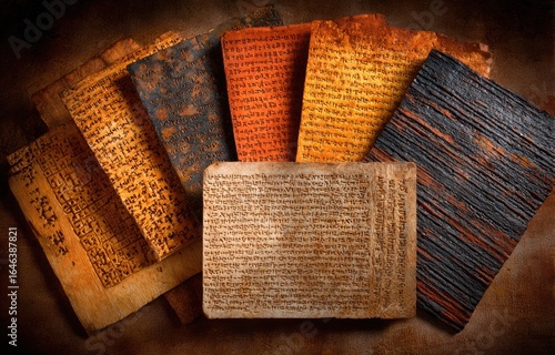 scroll, ancient, weathered, layered, parchment, manuscript, text, illuminated, historical, antique, document, brown, yellow, red, dark, ink, paper, page, vintage, history, writing, detail, close, up, surface, texture, old, aged, deteriorated, worn, orange, black, light, pattern, line, symbol, character, cognition, wisdom, learning, culture, preservation, time, artifact, collection, display
