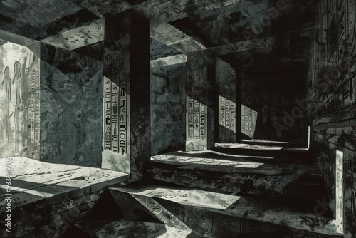 stone, corridor, hieroglyphic, ancient, wall, shadow, dark, light, dusty, textured, engraved, carved, egypt, tomb, passageway, entrance, mystery, exploration, ruin, architecture, historical, artifact, relic, culture, civilisation, history, secret, forgotten, lost, abandoned, desolate, eerie, atmospheric, moody, mystical, ominous, skittish