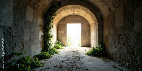 stone, passageway, tunnel, arch, doorway, opening, light, bright, green, foliage, plant, vegetation, overgrown, wall, ancient, aged, textured, rough, floor, ground, pathway, perspective, mystery, hope