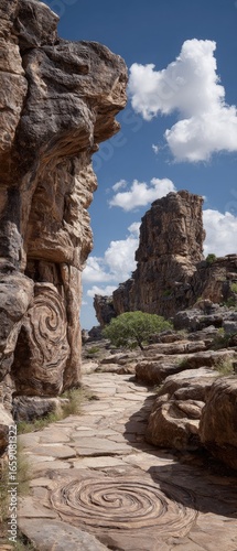 Ancient stone pathway winds between towering rock formations, adorned with intriguing spiral carvings