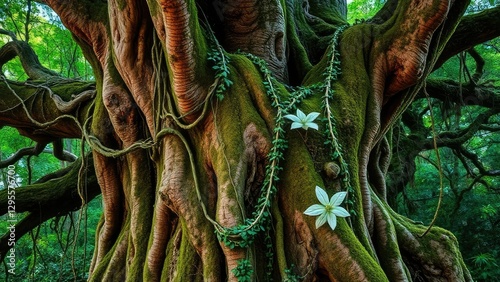 ancient tree with vines and moss-covered bark, wild, overgrown