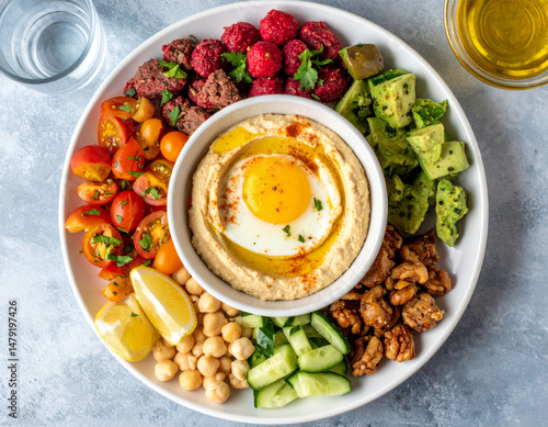 hummus, egg, vegetable, fruit, nut, healthy, colourful, plate, mediterranean, chickpea, cucumber, tomatoes, raspberry, avocado, lemon, snack, alimentary, fresh, epicure, meal, cookery, salad, protein, vegetarian, diet, appetising, culinary, organic, wholesome, delicious, vibrant, balanced, dish, food, platter, seasonal, presentation, healthy eating, ingredient, favor, texture, healthy lifestyle