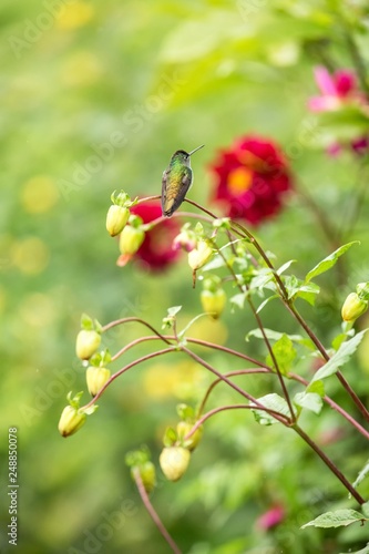 Andean emerald sitting on branch, hummingbird from tropical forest,Colombia,bird perching,tiny beautiful bird resting on flower in garden,colorful background with flower,nature scene,exotic adventure