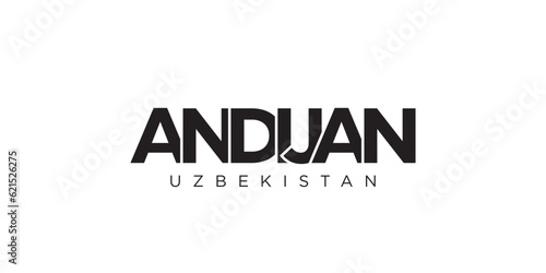 Andijan in the Uzbekistan emblem. The design features a geometric style, vector illustration with bold typography in a modern font. The graphic slogan lettering.