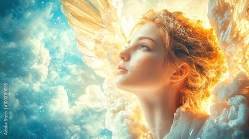 angel, wing, fire, sky, cloud, gold, heaven, light, aethereal, divine, celestial, spiritual, fantasy, hope, faith, religion, mythology, supernatural, power, beauty, grace, serenity, peace, calmness, sunset, sunrise, dramatic, glowing, majestic, awe, wonder, inspiration