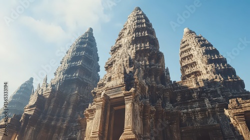 Angkor Wat rising against a clear blue sky, showing the temple grandeur and majesty