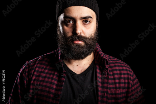 Angry bearded hipster guy on black background in studio photo