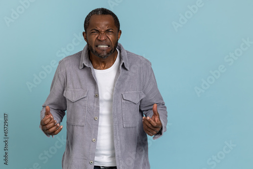 Angry black man wearing gray shirt clenched fists