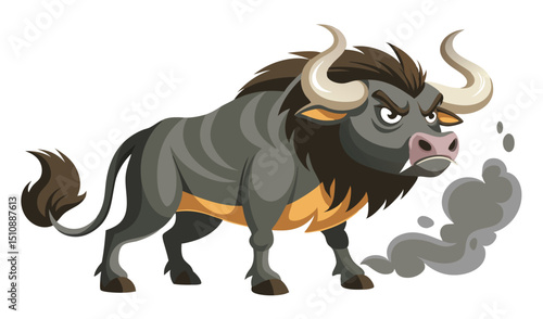 bull, cartoon, angry, horn, smoke, exhaling, mammal, animal, illustration, vector, graphic, design, powerful, fierce, strong, aggressive, wildlife, fauna, grey, brown, dark, isolated, white background, character, mascot, mythical, taurus