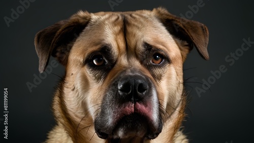 Angry dog with Furrowed brows, sharp gaze, mouth possibly tightly closed. A dog with a sad expression on its face. The dog's mouth is open and its tongue is hanging out