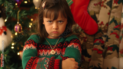 christmas, children, angry, festive, holiday, sweater, girl, portrait, decoration, tree, light, crabby, mood, unhappy, cosy, funny, expression, seasonal, celebration, emotion, winter, family, background, decoration, bokeh, indoor, traditional, joyful, playful, candid, scene, humor, cheerful, gathering, cute, iconic, quirky, home