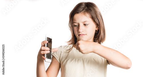angry little girl holding a smartphone with broken screen