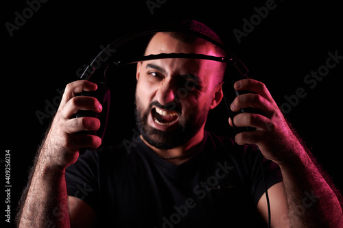 Angry screaming bearded arabic musician dj tearing headphones on black isolated background. International DJ Day