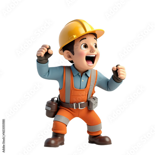 Animated cartoon character construction worker in a celebratory pose.