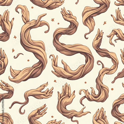 hand, flowing, pattern, seamless, animation, fabric, design, drawing, illustration, art, graphic, beige, cream, textile, surface, abstract, shape, whimsical, decoration, ornament, wallpaper, repeat, tile, element, artistic, decorative, fantasy, mystic, background, creativity, style, modern, texture, print, clothing, material, inventiveness, graphic design, clothes, vignetting, hand-drawn, hand gesture, display, creative