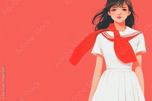 anime, girl, woman, female, portrait, illustration, art, digital, painting, drawing, red, foulard, white, dress, sailor, uniform, school, japanese, style, fashion, beautiful, pretty, cute, elegant, stylish, hair, long, brown, eye, face, expression, calm, serene, background, coral, colours, simple, minimal, artwork, graphic, design, aesthetic, vibrant
