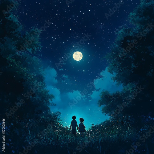 anime love couple under moonlight holding hands with sparkling stars