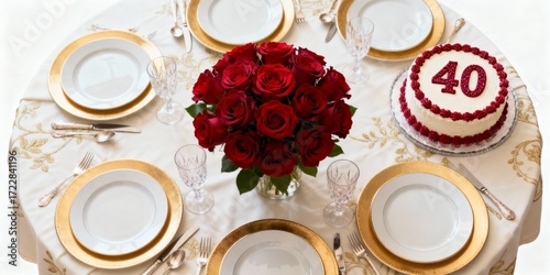 Anniversary table with red roses centerpiece and 40th cake decoration