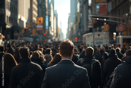 Anonymous Businessman in a Sunlit, Busy Street Crowd