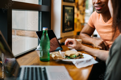 working, colleague, computer, discussing, communication, enjoying, caucasian, co-worker, casual attire, young, cafes, workspace, business, men at work, break, work, adult, together, technology, team, talking, smiling, sitting, sandwich, eatery, professional, person, people, modern, mobile, meeting, meal, lunch, lifestyle, laptop, indoor, healthy, freelancer, food, eating, eat, discussion, colleague, white, man, male, adult, 20s, grown-up, woman, female, lady, 30s