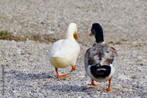 Ansicht eines Entenpaares von hinten. Dass Paar entfernt sich von der Kamera. Die Liebe ist zu fühlen