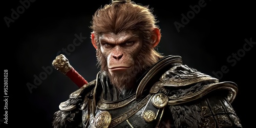 Anthropomorphic monkey king in armor with weapons on a black background