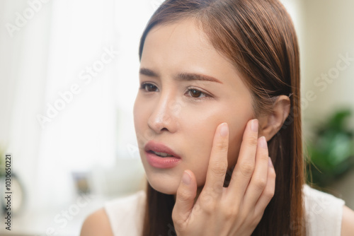 Anti aging, worry puberty asian young woman, stressed girl looking in mirror, allergy presenting an allergic reaction from cosmetic on face. Beauty, health care from acne problem, dry skin, treatment