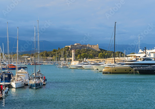 antibes, cote d'azur, southern france, port, sea, water, mediterranean sea, boat, sailboat, yacht, marina, church, house, building, panorama