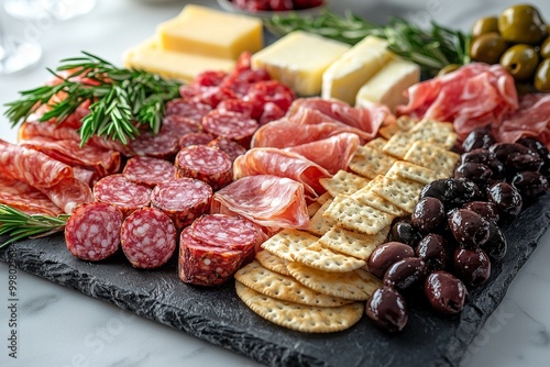 Antipasto platter with prosciutto crudo or jamon, ham, salami, cheese, olives and grapes. Elegant charcuterie board with a variety of cured meat.