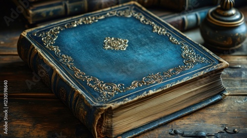antique, book, teal, leather, cover, gold, accent, ornate, vintage, old, aged, worn, texture, page, spine, gilded, detail, craftsmanship, history, literature, classic, elegant, luxurious, decoration, design, pattern, floral, scrollwork, frame, binding, wooden, table, desk, inkwell, study, library, cognition, wisdom, reading, story, paper, gilt, embossed, century, rare, volume, text