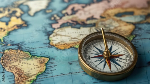 Antique compass needle pointing to an unexplored region on a detailed world map
