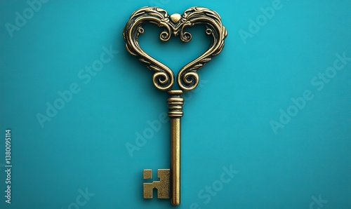 Antique Golden Heart Shaped Key Teal Background Vintage Ornate Keyhole love metal decor image style