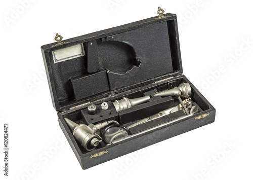 auroscope, tube, instrument, exam, medicals, doctor, old, set, antique, vintage, metal, kit, glasses, apparatus, white, tool, open, disassemble, black, box, case, science, tubing, ancient, ear, dust, dirt, grunge, stainless steel, casket, retro, nostalgia
