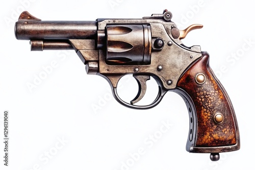 handgun, gun, weapon, firearm, vintage, antique, old, metal, isolated, clipping path, revolver, handgun, rust-eaten, aged, worn, history, military, western, cowboy, collection, object, photo, still life, background, image, texture, detail, closeup, dark, shadow, grey, brown, black, chrome, weaponry, munition, cartridge, shooting, range, target, defense, security, dangerous, lethal, heritage, artifact