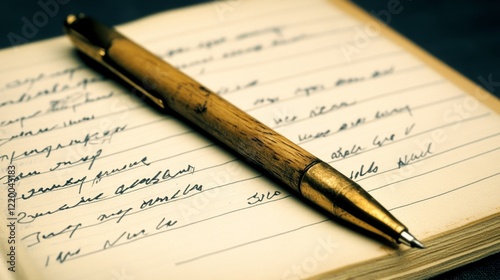 Antique Pen Rests on Vintage Notebook with Handwritten Notes