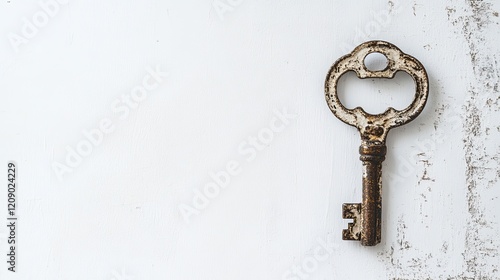 key, antique, rust-eaten, old, metal, white, wood, background, vintage, aged, iron, texture, weathered, grunge, ornate, design, element, object, detail, pattern, surface, material, brown, grey, colours, contrast, style, decorative, home, house, lock, secret, mystery, security, access, open, closed, history, past, time, relic, treasure