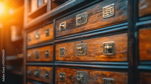 antique, wooden, cabinet, drawer, filing, storage, furniture, vintage, ornate, brass, dark, brown, wood, detail, closeup, design, classic, elegant, library, office, study, home, decor, interior, woodwork, handle, cabinet, organisation