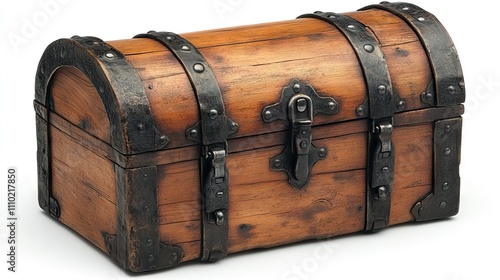 Antique wooden treasure chest with metal accents, positioned on a clean white background, highlighting craftsmanship and design details, vintage, storage, decorative item.