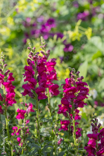 Antirrhinum majus - deep pink flowers growing in the garden with beautiful bokeh.