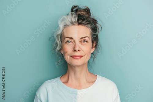 severity, ageing, face, duality, lift, cleaving, skincare, identity, ageing, half, prevention, contrasting, youthful, age, grow old, complexion, age, mature, skin, contrast